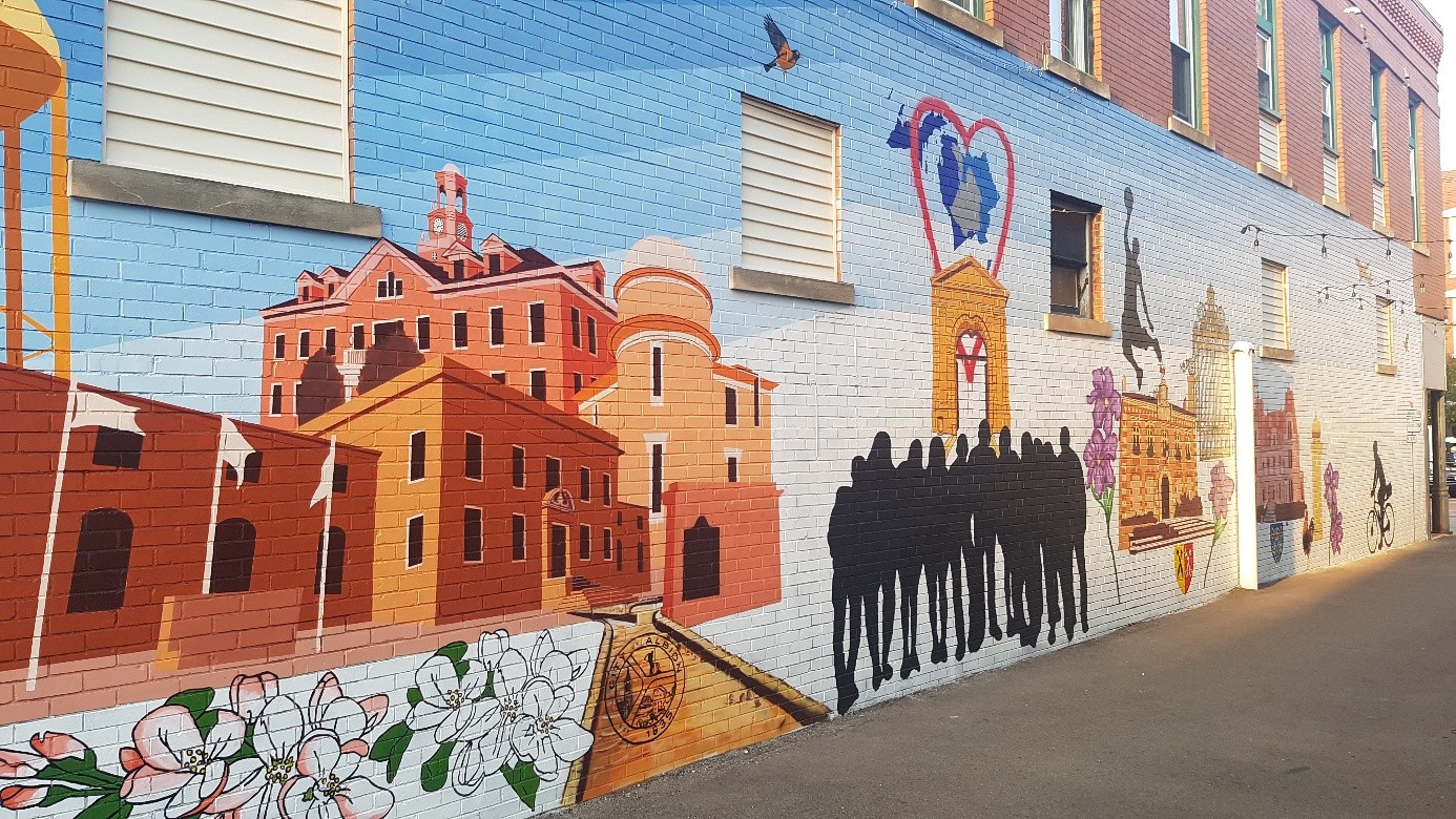 Cette année, le séjour de la délégation s’est déroulé du 17 au 23 septembre, et il fut riche en rencontres, en réunions et en événements. L’événement majeur fut l’inauguration d’une très grande fresque dans une allée qui débouche sur la rue principale. Beaucoup de sympathisants du jumelage étaient présents. L’artiste, Michael Dixon, professeur d’arts plastiques à l’université, qui a réalisé cette œuvre, aidé par les jeunes qui étaient venus nous rendre visite en juin 2024, a travaillé 2 mois pleins. Cette œuvre témoigne des relations très fortes qui perdurent entre nos communes.